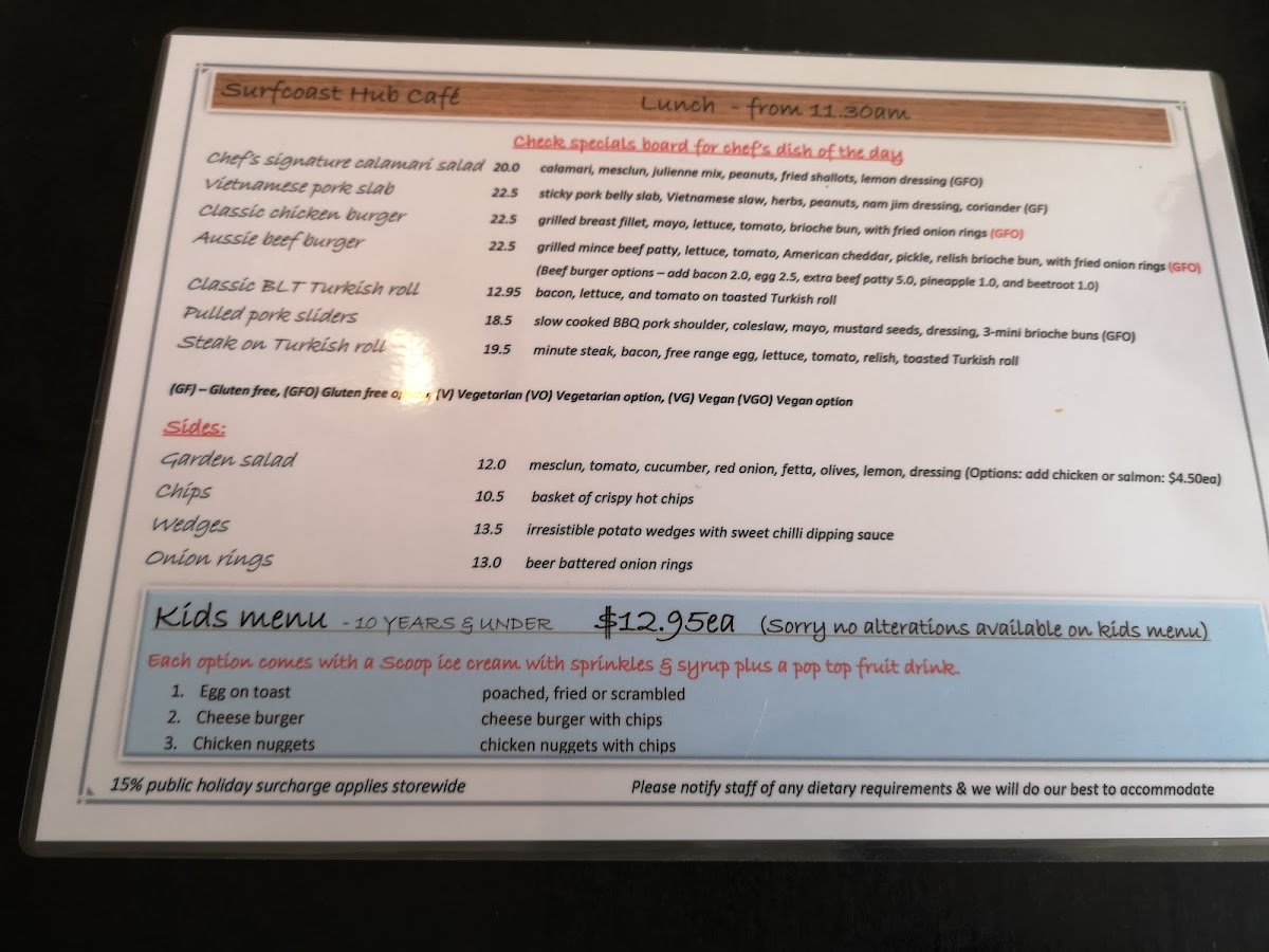 Lunch selections include casual favourites such as burgers and salads alongside more distinctive dishes like turmeric pappardelle with Napoli or Bolognese sauce, offering variety without complication. Snacks like onion rings and fries fit perfectly with a relaxed catch-up or a break from the beach.